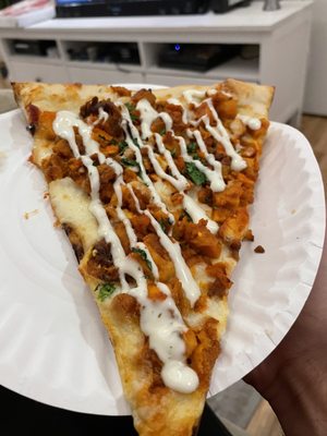 Tangy BBQ chicken on extra cheese with blue cheese on the side for dipping.